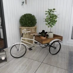 - •This decorative planter showcases a romantic tricycle structure with wheels and a wood rectangular plant stand box