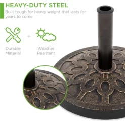Turn your garden into a stately space for entertaining and enjoyment! This umbrella stand combines style and function in one attractive package. The antique design is beautifully glazed in an antique bronze finish to look stunning in any setting. Built tough for heavy weight that lasts for years to come, the heavy-duty steel is a durable material that you can rely on for any occasion. This item is built to last; weather-resistant material makes for a sturdy base that lasts for years to come. This stand is the perfect fit for most umbrellas and boasts a pole diameter of 1.5in. The sturdy base is built to accommodate standard umbrellas ranging from 7.5 or 9 feet without tipping over.