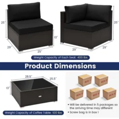 Crafted with high-quality PE wicker, this stylish conversation set is both elegant and durable.All the 10 pieces are firmly supported by heavy-duty metal frame, ensuring high-level sturdiness.And the sofa fastener clips ensure stability and a cohesive look.In addition, the seat and back cushions provide exceptional comfort. And the zipper design makes the cushion covers easy to remove and wash. Apart frame that, the free combination of the sofa set makes it a perfect addition to create a personalized outdoor oasis for relaxation and entertaining.