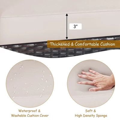 - Size of Patio Wicker Sofa Set: Table size: 20” x19”(LxH), chair size: 26” x 27.5”x31” (LxWxH), armrest height: 24”, seat height: 13”, cushion thickness: 3”, chair weight capacity: 360 lbs, table weight capacity: 90lbs