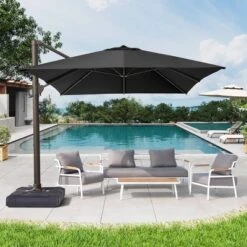 Using large 11.5ft patio upgraded square offset umbrella is a fantastic way to help you enjoy your outdoor room. You can move the pole to any outdoor spot you like with the cantilever design, without worrying about it getting in the way of dining or entertaining. With 100% 240g solution dyed polyester fabric, our patio umbrella provides 10×10 feet of sun protection for vast areas. The UV protective and fade-resistant canopy is spread over 8 ribs with a single wind vent for 500 hours color fastness in the sun that allows for wind and air to be safely “vented” through your umbrella. The lightweight durable Aluminum pole can resist the most of things from the environment throws at it, and the gray coating on the pole gives you a stylish touch feeling. It is easy to adjust the shade, 7 height and angle to ensure you are covered.