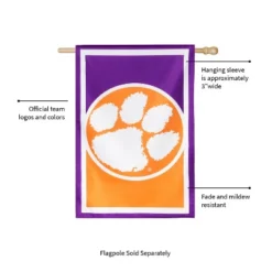 - Features Clemson University colors of orange and white. Showcase your fandom for this national powerhouse with the officially licensed Clemson University logo on this unique house flag. It’s perfect for displaying during your favorite college sports season or year round.