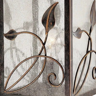 Bring the charm of a country garden to your yard or driveway with this outdoor post light from Franklin Iron Works. This lantern-style fixture comes in a bronze finish frame with seeded glass panels for a lovely old-fashioned look. A scrolling leaf-and-vine pattern runs across the sides for a beautiful decorative accent.