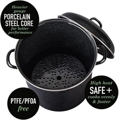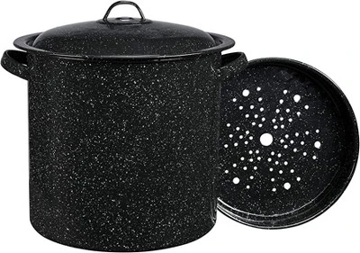 - Heavy gauge enamel-on-steel pot with removable steamer insert