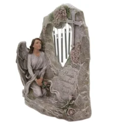 A Delicate Angel Kneeling Looking Up To The Cross And Holding A Bouquet Of Roses In Her Hands. The Stone Behind Her Has A Cross At The Top And A Heart Shape Cut Out In The Middle. Wind Chimes Hang With In The Heart. Soft Pink Roses And Green Leaves Accent The Stone. New. Comes Packaged In A Box.. Measurements 11 In H X 8.5 In W X 3.75 In D. . No Assembly Required. Indoor Or Outdoor Use. Imported