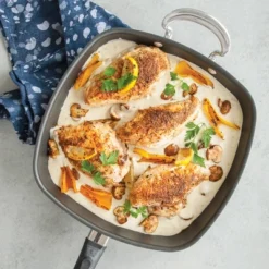 Whether you cook for a crowd regularly or just on special occasions, you know that owning a large capacity pan is crucial when you’ve go a lot of hungry folks to feed. This generously sized pan, in a square format, offers more than 20% additional cooking capacity than a 12″ round sauté pan, maximizing your cooking output eliminating the need for multiple pans. High sides serve multiple purposes, from helping to contain splatters to allowing you to cook saucy food you wouldn’t dare put into a regular shallow sauté pan.