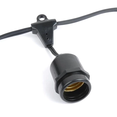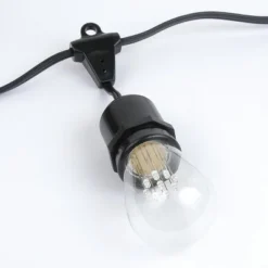 Novelty Lights clear S14 medium base bulbs string light set with 50 bulbs on 100′ of commerical grade black wire. These are our most durable string light sets and are suitable for year round outdoor use and permanent lighting applications. Each set includes 50 S14 medium base bulbs on a commerical grade black wire stringer with 50 sockets that are spaced 24″ apart. These clear S14 light strings have long-lasting 6,000 hour bulbs and are on a heavy duty 16 gauge SPT-2 black wire stringer. Each socket is made with PVC plastic to provide a water-tight seal and to ensure no defects due to weather. These durable and heavy duty light strings will provide you with years of maintenance free use. Perfect to use on any patio, restaurant, backyard, pergola, wedding venue, or town square for hanging outdoor string lights.