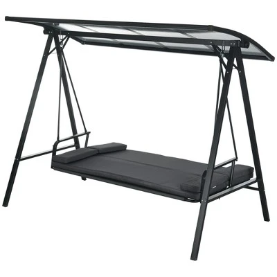 Bring the comforts of inside outside with Outsunny. Our porch swing comes with a canopy and converts into an outdoor bed. Featuring a fully cushioned surface, seat and back, it’s exceptionally cushy and becomes the mattress of a bed at a flip of the frame. Also, pillows on the ends give you cozy armrests that become a place to rest your head. The canopy is adjustable and has a hard surface that’s a UV-proof tinted roof to let in light, not make you bear glare. Get out, get comfy, get Outsunny.