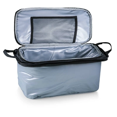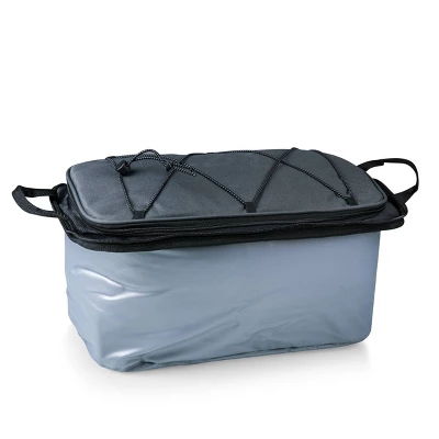 Picnic Time is proud to introduce our patented Vulcan Portable Propane Grill & Cooler Tote, a travel grill set and insulated cooler in one! A 24-can capacity, fully-removable cooler nestles securely into the main compartment which holds the portable LP (propane) bbq grill and lid, and an exterior zip-up compartment holds three stainless steel grilling tools with aluminum handles and non-slip thumb grips including: one large spatula with an integrated bottle opener, one bbq fork, and tongs. Exterior pockets with drawstring closures are designed to hold camp propane tanks (not included). With an adjustable shoulder strap with comfort pad, a reinforced waterproof base, three large zippered exterior pockets to store personal effects, padded carry handles, and a stretch cargo cord on the top of the tote to carry a blanket or towel, this BBQ kit will win the tailgate party, hands down!