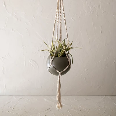Hang your plants in decadence with this macrame hanging planter from Foreside Home & Garden. This lovely round pot, in an earthy green metal, rests comfortably in the macrame rope netting. Your arrangements will flourish as they float from this simply gorgeous display.