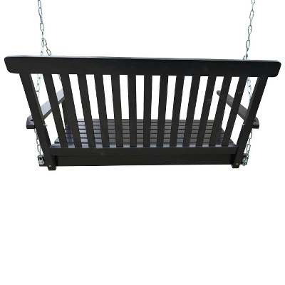 This swing chair offers 2 comfortable seats so you can enjoy the outdoors with your partner. Designed with a sturdy fir wood frame and horizontal slats, it will provide any garden or deck with a relaxing space for you and your family to unwind. The sophisticated design brings life to your outdoor space, perfect for gardens, patios, balconies and poolsides.Specifications:Color: BlackMaterial: Fire WoodWeight Capacity:800 lbsItem Weight: 25 lbsOverall Dimension:47.2” (L) X 28.15” (W) X 23.62”(H)Features:Sturdy wood porch swing holds up to 880 lbsMade of fir wood, sturdy and durableSurface treated with waterproof varnishHigh-quality fir ensures that it will not easily crack or rot