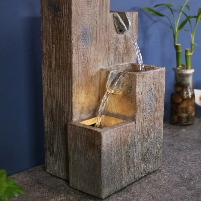 Make any office, living room, bedroom, or other personal space a little more peaceful and tranquil with this indoor tabletop fountain. Durably constructed of easy-to-maintain polyresin, this fountain features the attractive look and feel of real wood but is easy to clean. Promote relaxation in the home or office with this easy-to-assemble fountain that doesn’t require any complicated plumbing or installation with the included, electric submersible pump that stays quiet so that the water soundscapes can expand. The cascading water goes down into the bottom tier where it is circulated back up to the top so the water can continuously fall through the divots in each layer. The bottom basin features a built-in LED light that illuminates the flowing water, making this a great piece of decor to enjoy in the evening when the sun goes down.