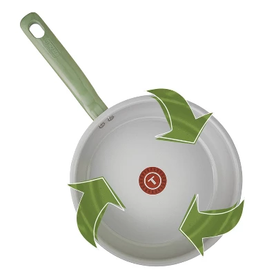 Healthy cooking and reduced eco-impact* with T-fal Fresh Simply Cook Recycled Aluminum Ceramic 2-Piece Set. The ceramic interior allows you to cook with little to no oil, and cookware features a recycled aluminum body. Thermospot Technology indicates when the pan is perfectly preheated to start searing, sautéing or frying, and the even heat base gives no hot spots for reliable cooking results. Dishwasher and oven safe up to 350°F and compatible with all cook tops, excluding Induction. Set contains 8.5″ and 10.25″ Fry pans. *Reduced impact on environment by using 100% recycled aluminum body.