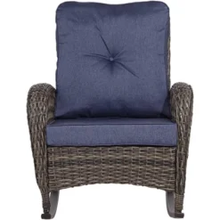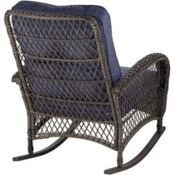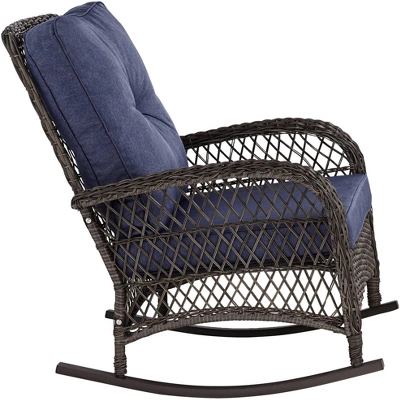 Breathe in the fresh air of the outdoor with this coastal style Madden rocking chair, from the Teal Island brand. Woven threads of rattan create an alluring construction, embracing an easy natural elegance. The dark blue seat and back cushions ensure lounging in comfort is always available. The perfect choice to spending time on your porch or patio area.