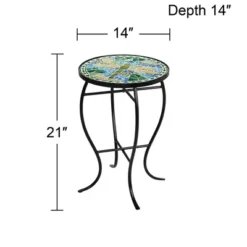 This round outdoor accent table features an inlaid tile top featuring a colorful dragonfly mosaic. The frame and curvaceous legs are constructed of black finish iron that will withstand the elements. From the Teal Island Designs brand, this table is a great way to add fresh style and function to a porch or deck.