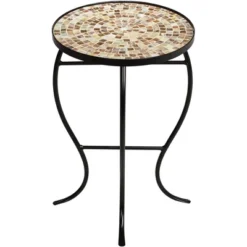 These round outdoor accent tables set of two feature a sophisticated inlaid tile mosaic top made from real mother of pearl. The frame and curvaceous legs are constructed of black finish iron that will withstand the elements. From the Teal Island Designs brand, these tables are a great way to add fresh style and function to a porch or deck.