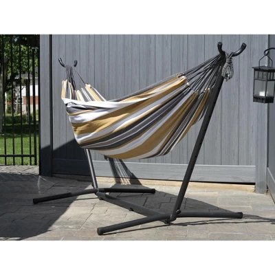 - Gray And Gold Striped Hammock With A Steel Hammock Stand Set