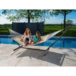 This striped quilted hammock is the perfect way to relax near your pool and enjoy the sunshine! Read a book, take a nap or have a drink while swaying in the warm breeze this summer with this hammock. This hammock is perfect for hanging between trees, on your balcony or in a hammock stand. Order your hammock today to relax under the warm sun with the people you love this summer!Features:Striped colorful quilted hammockThe bed length is 84”This hammock can hold up to two peopleRecommended for outdoor useWeight capacity: 450 lbsDimensions: 144 inches long by 60 inches wideMaterial(s): hardwood, polyester Note: Stand and hanging hardware are not included