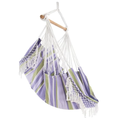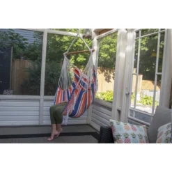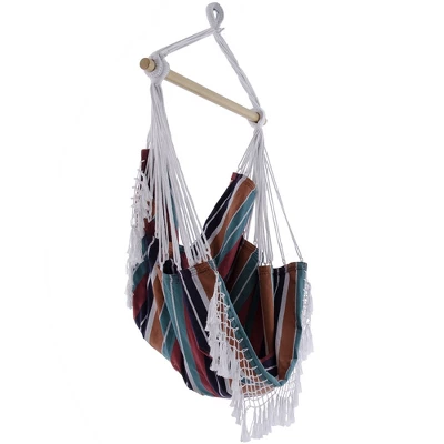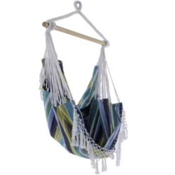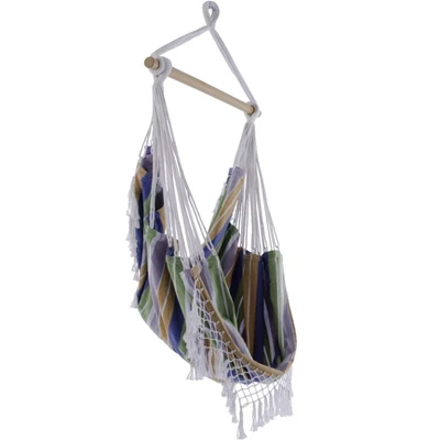 This Brazilian Hammock Chair is constructed of tightly woven 100% cotton, making this the most relaxing chair you will own. Now available in ten specially-selected color combinations with a coordinating, hand-crocheted fringe on both ends that adds a Bohemian touch to any space. Once set up, there’s additional fabric that stretches up behind you, providing you with the perfect place to rest your back. The hammock chair can be used both indoors and outdoors due to its small footprint and arrives with the wooden spreader-bar and additional sling. The hooks and springs are sold separately.