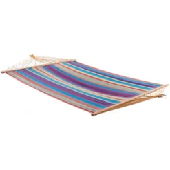 This single-layer cotton spreader bar hammock combines the comfort and breathability of a Vivere’s cotton hammocks with the beauty and functionality of a spreader bar hammock. Choose from Vivere’s top-selling hammock colours and patterns now available in a spreader bar hammock with a wood bar sealed and coated with marine stain. This hammock is easy to set up between two posts, trees or pair with one of Vivere’s large hammock stands. Easily roll and store the hammock during unpleasant weather.