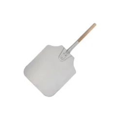 Winco aluminum pizza peel with a 12″ x 14″ blade. The handle is constructed from wood. The extra large peel allows for pizzas to easily be removed from an oven without breaking or snagging, and it is easily rotatable for use in tight areas.