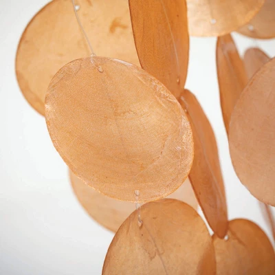 A cascading chime in a pleasing color, reminiscent of a gift of nature. Our handcrafted capiz windchimes are made by Balinese artisans. Hand strung and hand dyed, these chimes are made of natural, renewable materials. When touched by the wind, your chime will produce a delicate tinkling musical sound.